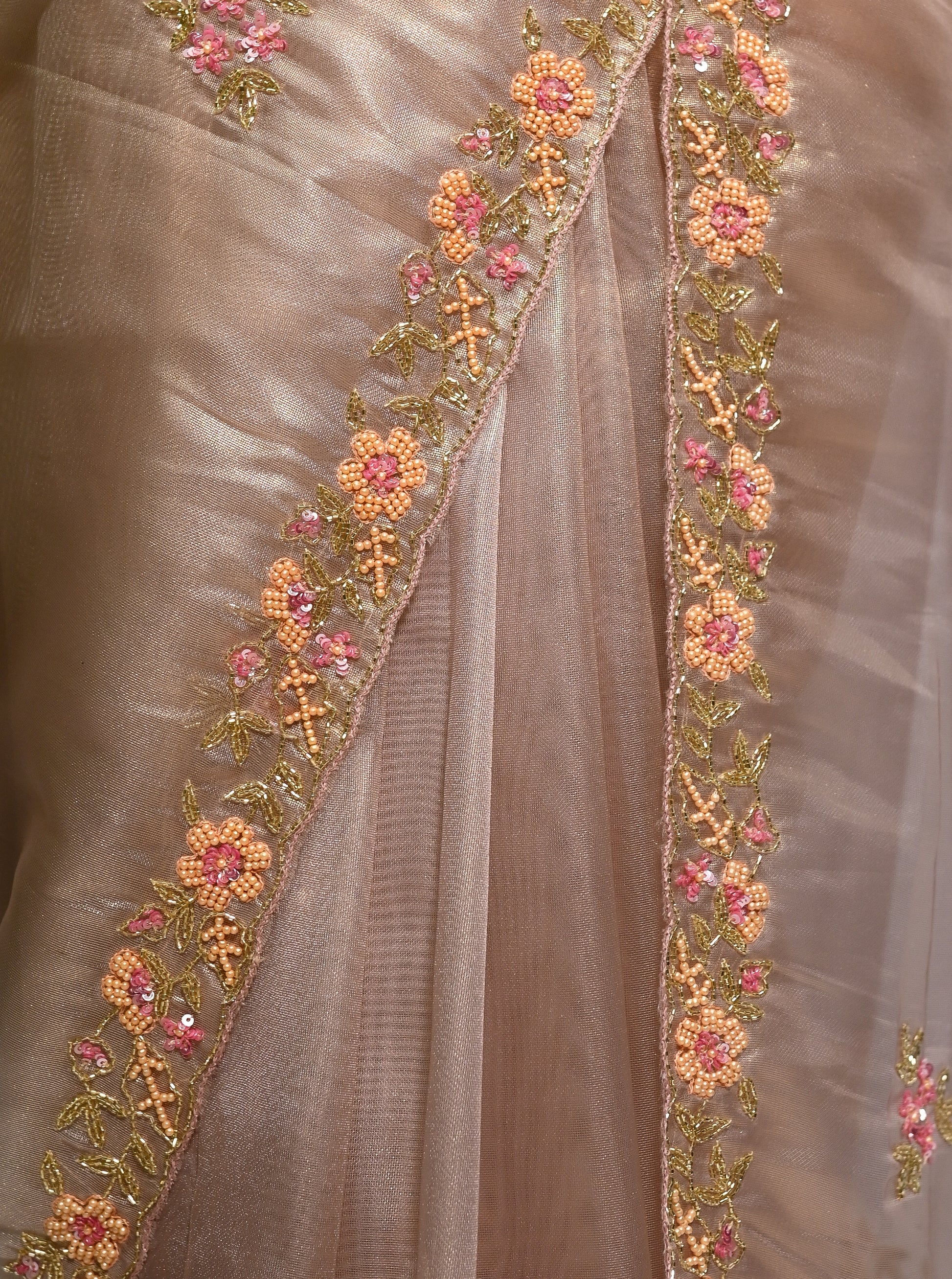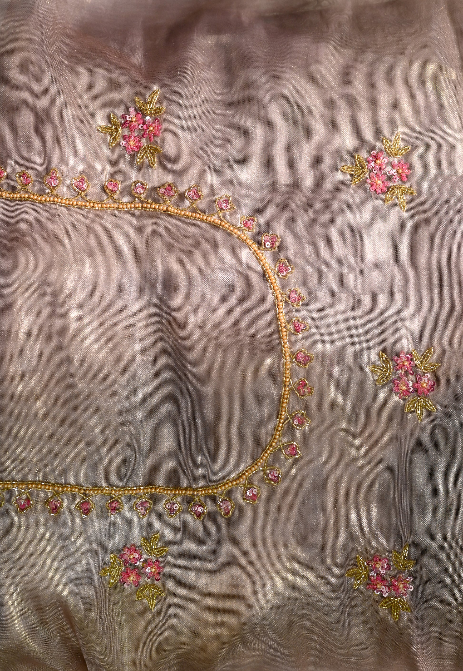 This light pink Designer Tissue Saree features intricate handwork that adds a delicate elegance to its sheer fabric. Paired with a heavily embellished blouse piece, it offers a refined and sophisticated look perfect for special occasions. The lightweight organza tissue material ensures comfort while maintaining a graceful drape. Ideal for those seeking a blend of traditional craftsmanship and contemporary style.