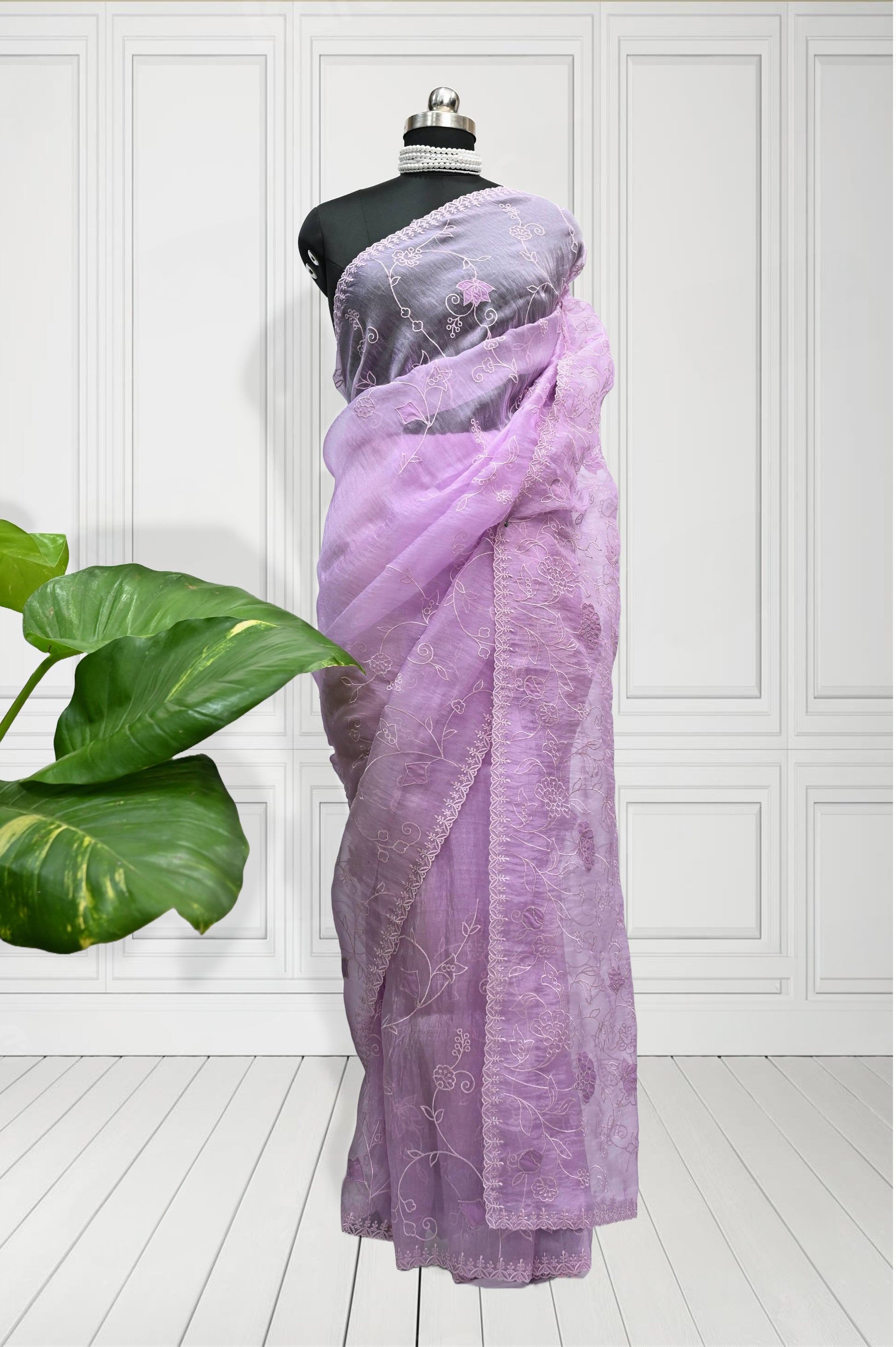 Elevate your ethnic wardrobe with this exquisite Lavender Organza Saree, featuring intricate all-over embroidery that adds a delicate, sophisticated texture. Crafted from lightweight organza, it drapes gracefully, offering both elegance and comfort. The saree comes with a matching running blouse, perfectly complementing the detailed embroidery and ensuring a cohesive, polished look for special occasions. Ideal for those who appreciate fine craftsmanship and timeless style.