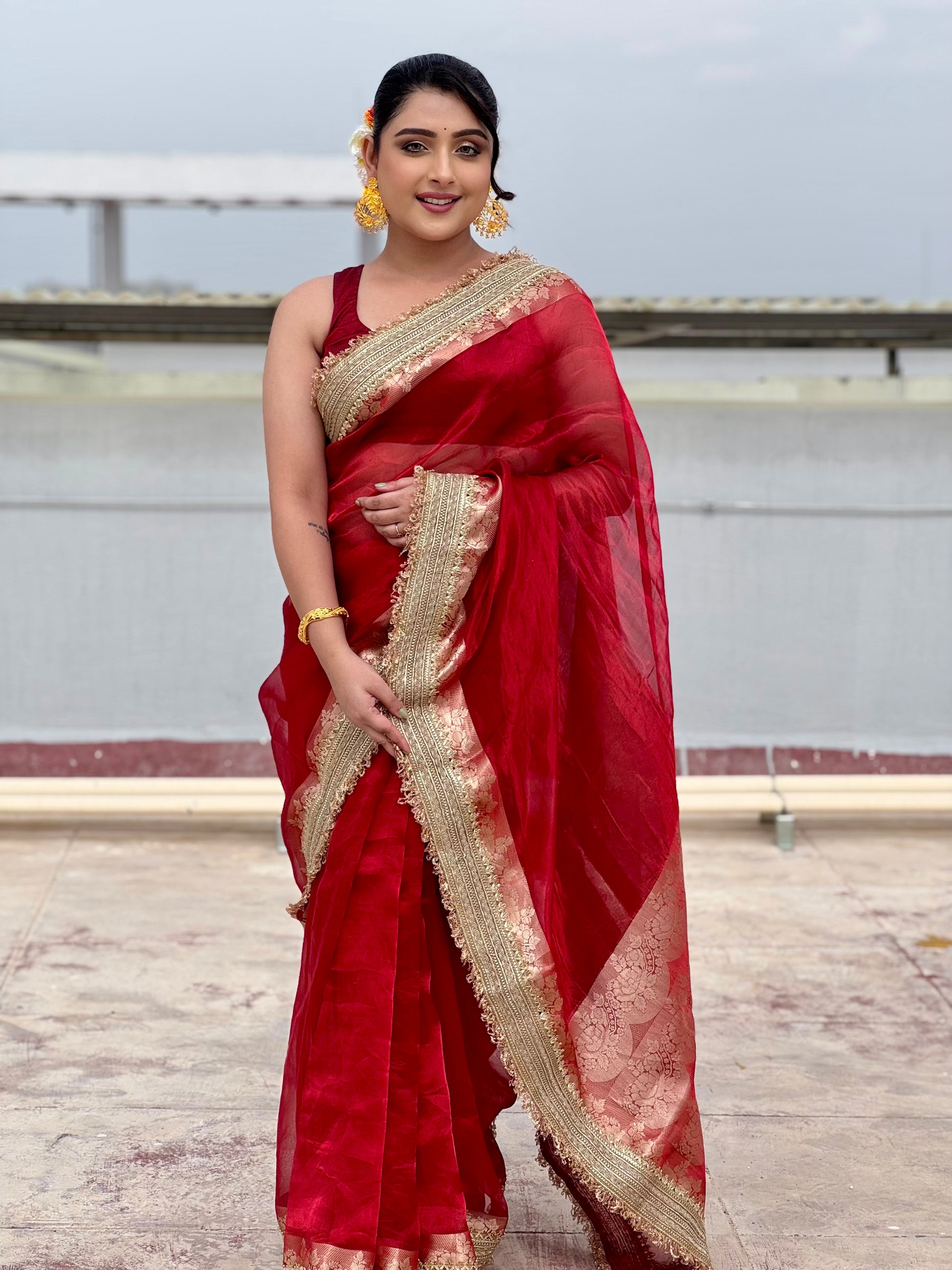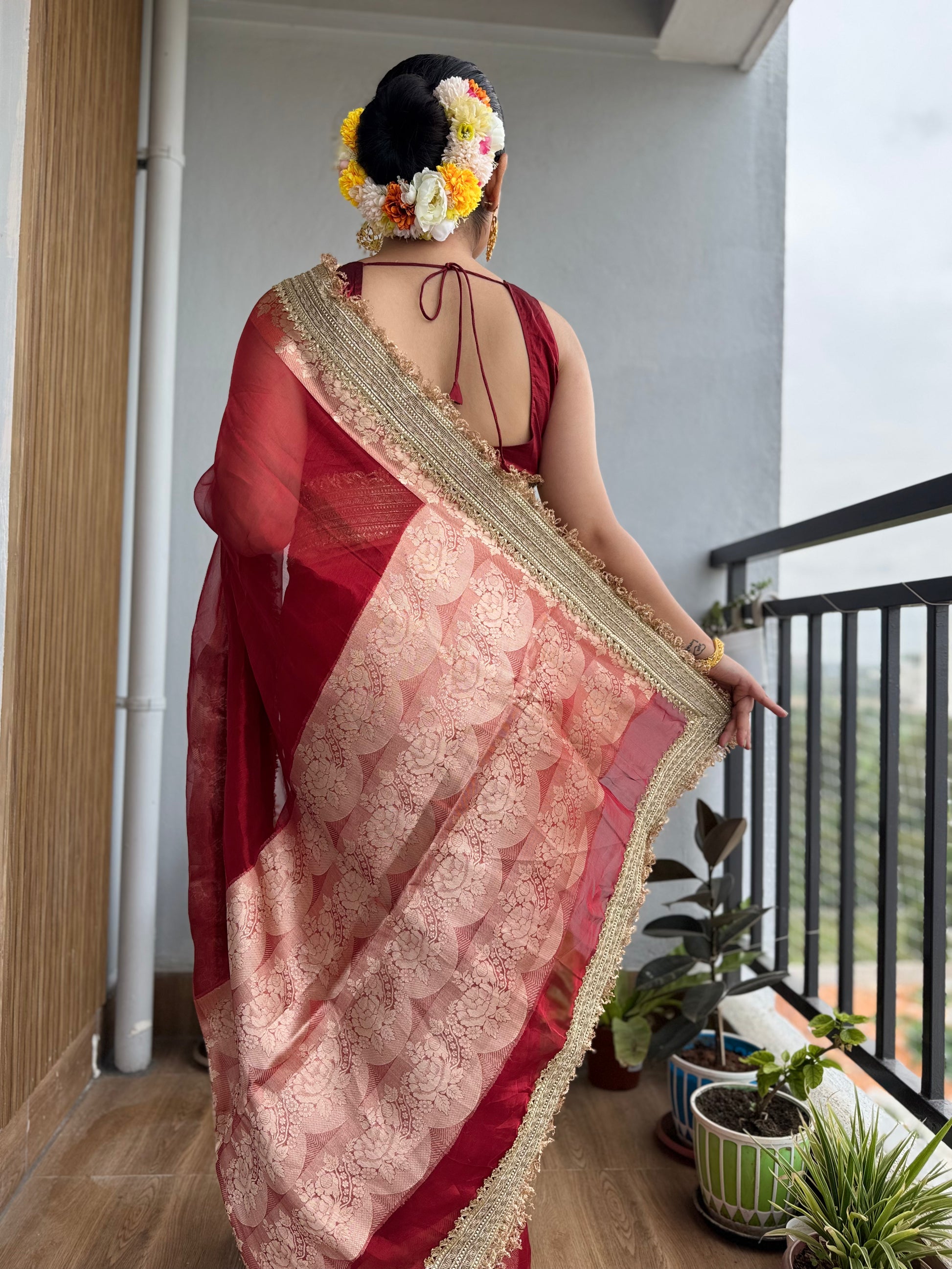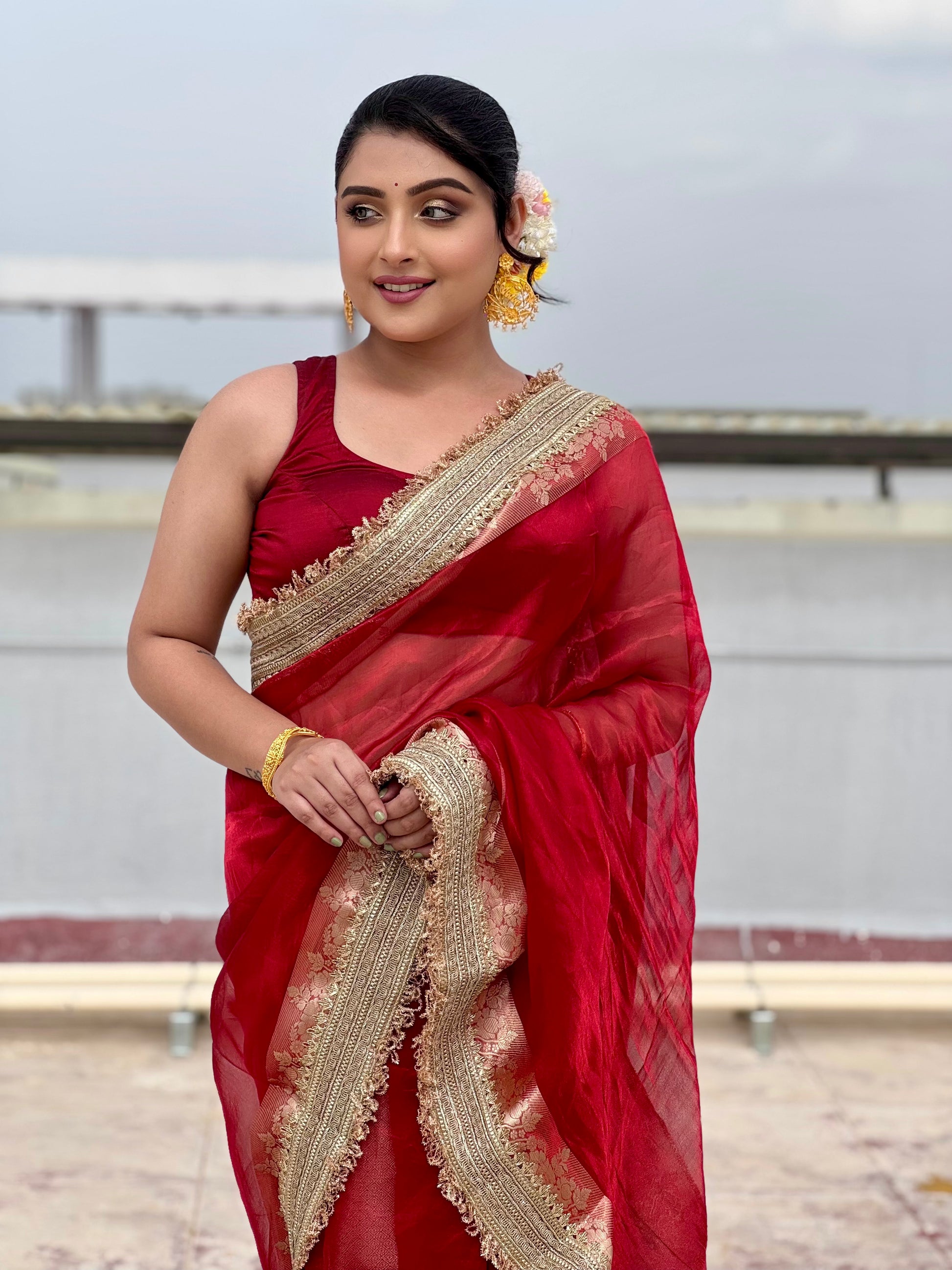 Expertly crafted, the Maharani Pure Tissue Saree in red offers a touch of luxury to any occasion. Made from pure tissue fabric and featuring a delicate brocade blouse, this saree exudes elegance and sophistication. Elevate your style with this stunning piece.
