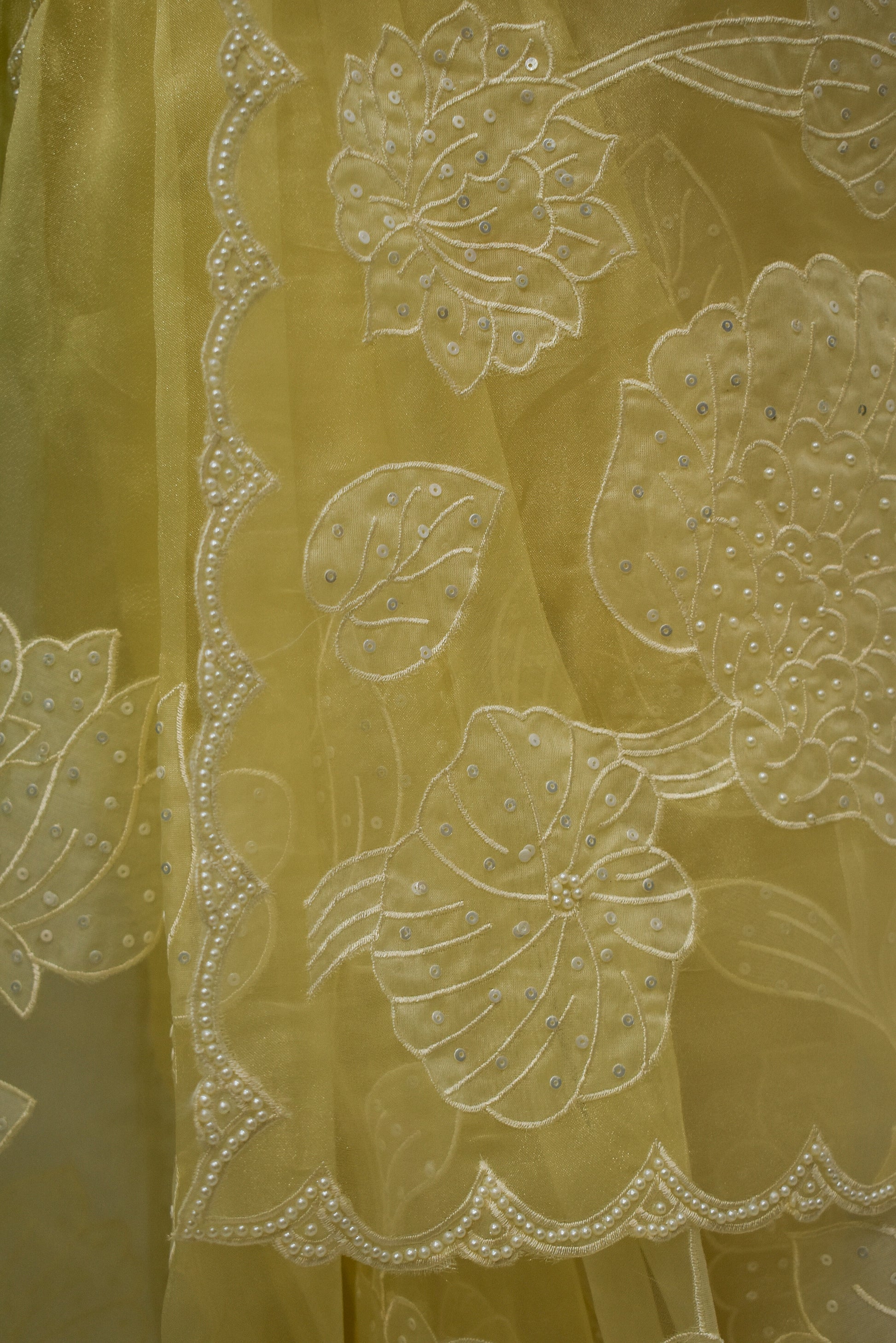 Yellow Pearl & Sequins Pure Organza Saree